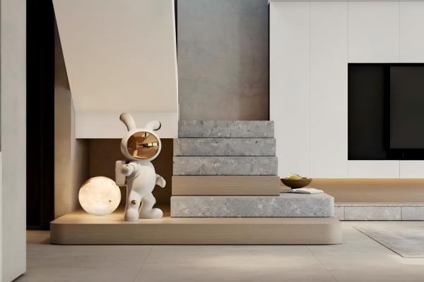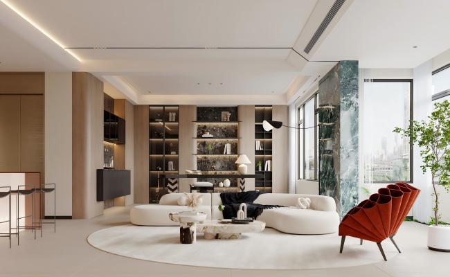 情緒轉場,引景入室。拆除原始封閉隔墻,通過結構與柱體內退,解構形成一個開合的半開敞式空間,內置懸浮地臺與軟膜燈光,將自然景觀的意境與現代幾何穿插,形成“進門即劇場”的內退式開場,虛實之間一步一景。 燈光與體塊形成的光影變幻,推門而入,一場視覺的“暗夜序曲”悄然展開。玄關墻面以啞光微水泥鋪陳,肌理粗糲中透出細膩,搭配線性燈帶從入戶延伸至客廳,整個通道運用了燈光的鋪陳渲染了氛圍