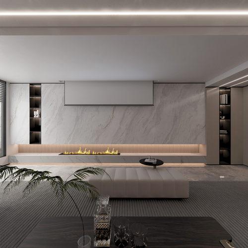 該現代風格空間以米白與木色構建溫潤基底,大理石地面提升空間質感。淺色系布藝沙發搭配焦糖色、墨綠抱枕,豐富視覺層次;藝術掛畫與玻璃休閑椅增添設計巧思,異形茶幾結合金屬與石材,勾勒精致線條。大面落地窗引入自然光線,將休閑與用餐區流暢銜接,讓簡約設計兼具舒適與高級感。