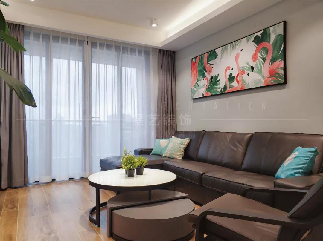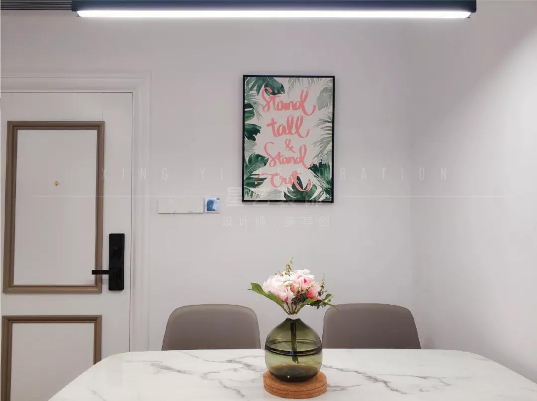客廳沙發(fā)背景墻選擇帶有火烈鳥圖案的掛畫,呼應(yīng)了擺放在客廳里那棵較大的植物,火烈鳥寓意自由熱烈、優(yōu)雅活力,跳躍整個(gè)空間寧?kù)o的氛圍。
