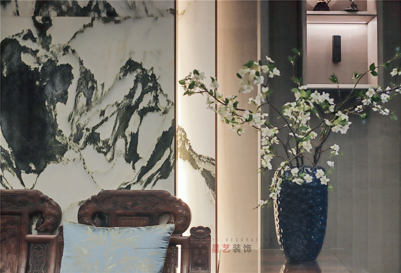 客廳采用古色古香的紅木家具,雕刻不繁復,顏色不沉悶,整體端莊大氣,沉穩時尚。尤其是水墨紋路的大理石墻面,提煉出古典元素的精髓,綠盆景更是讓整個設計提升了清幽雅致的風水畫格調。