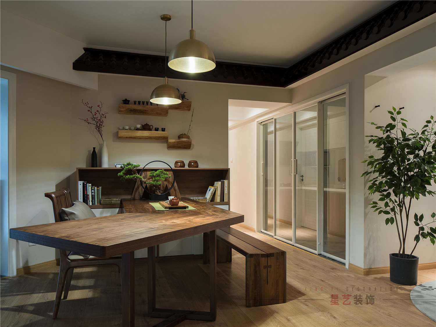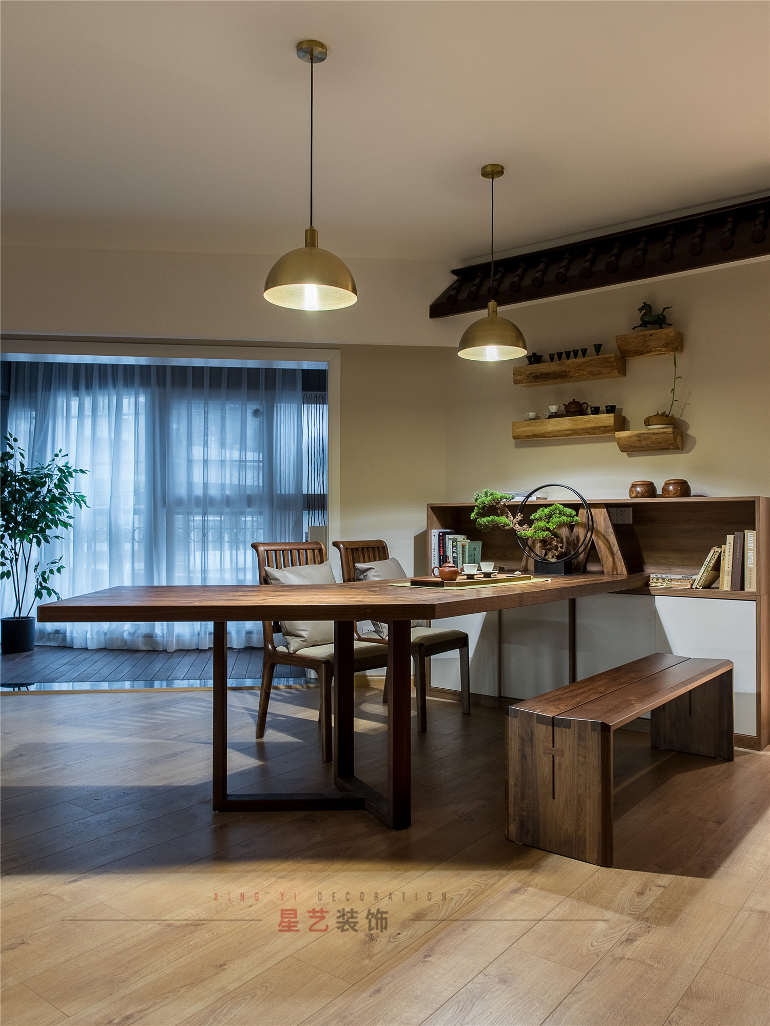 餐區才是家庭的主要活動區域,設計師特意訂制了超大的異形實木桌,滿足客戶用餐、辦公、泡茶談琴、寫字與孩子做作業的功能。