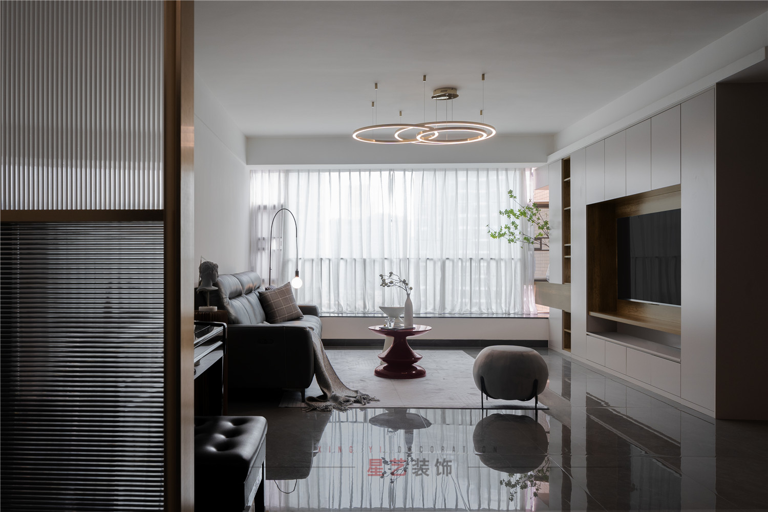 走進大門,迎面的光線穿過屏風給人一絲絲的柔和和神秘,客廳背景設計兼顧儲物和整體的空間提升,開放格的選擇尤為重要。