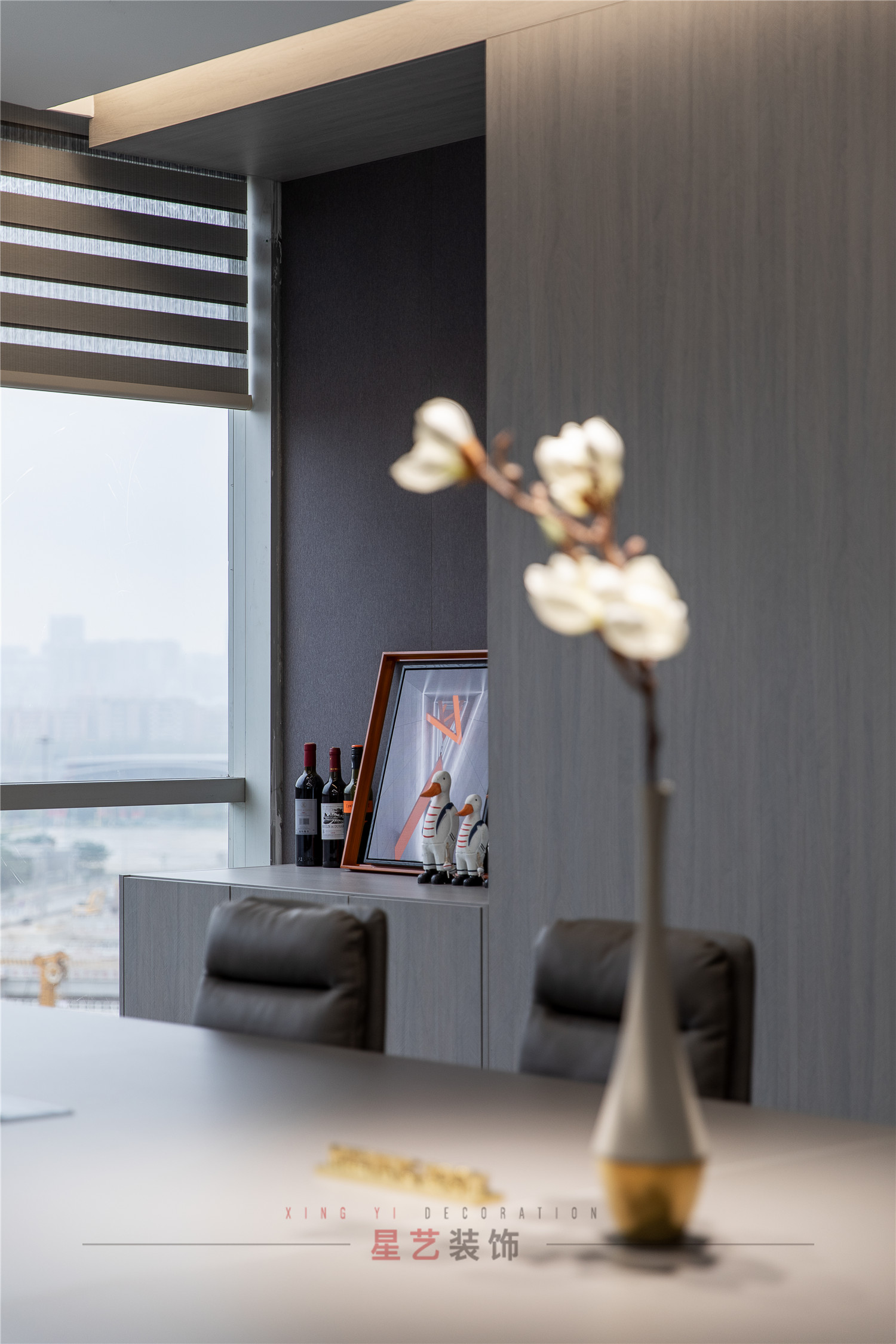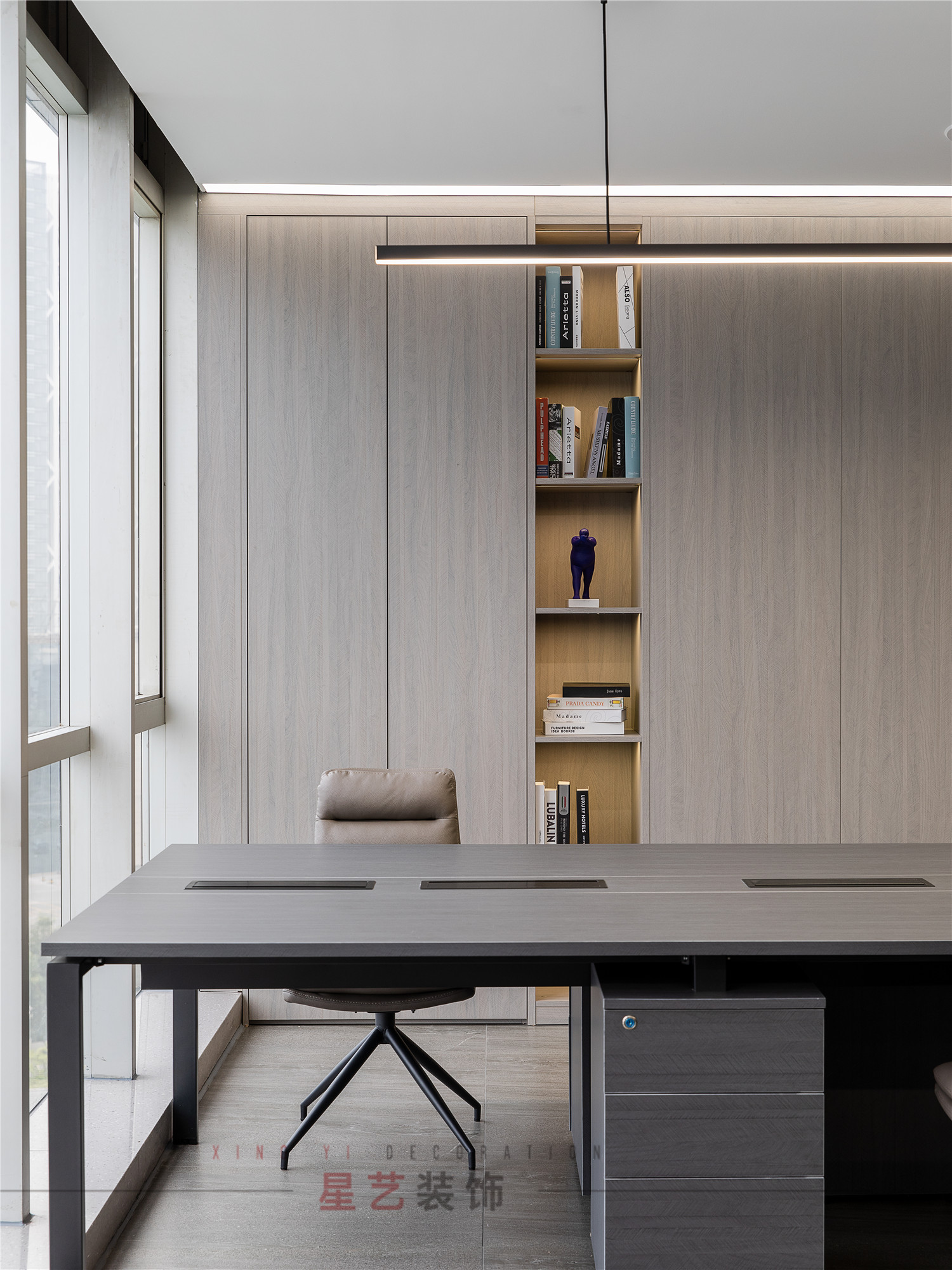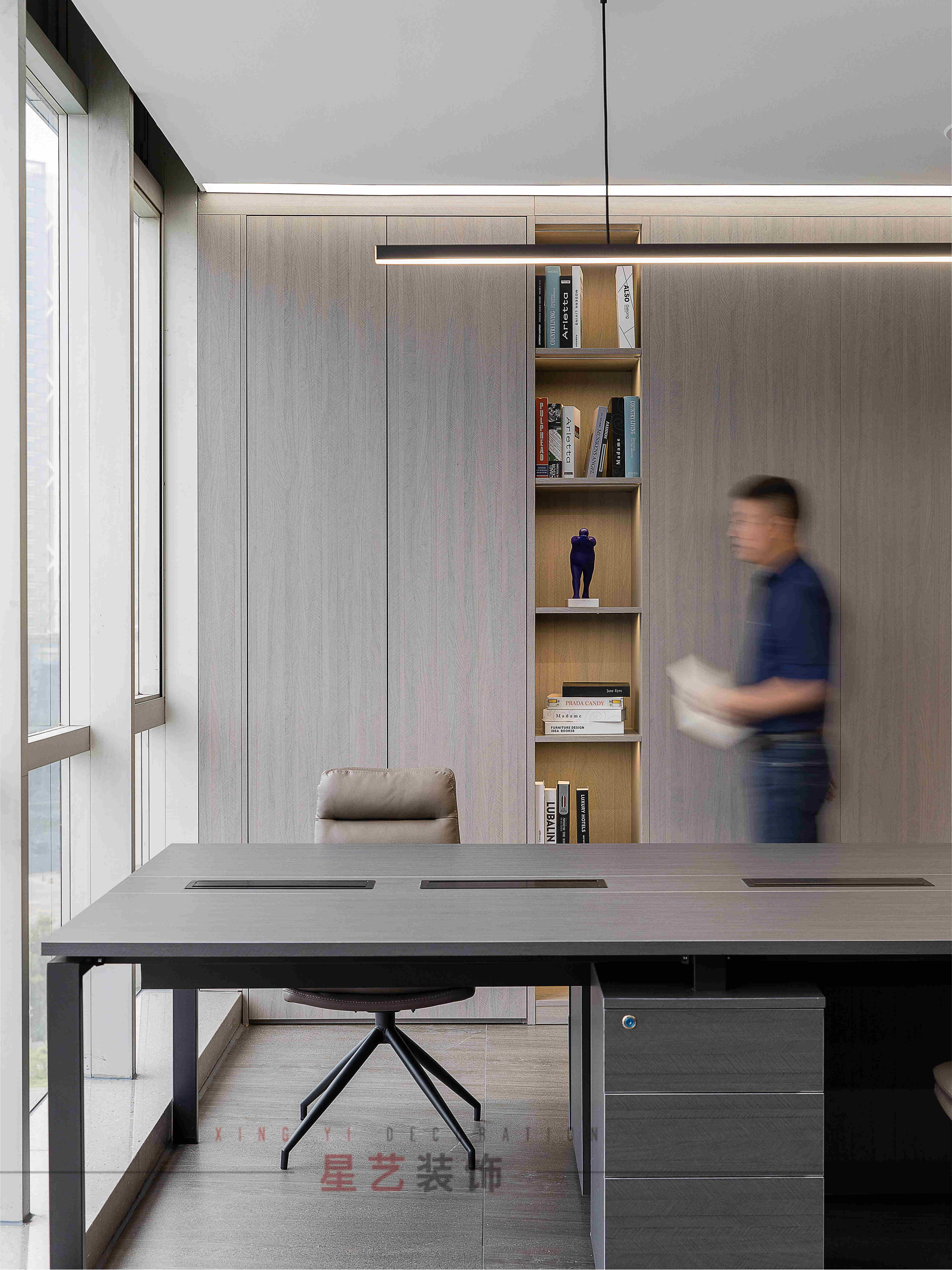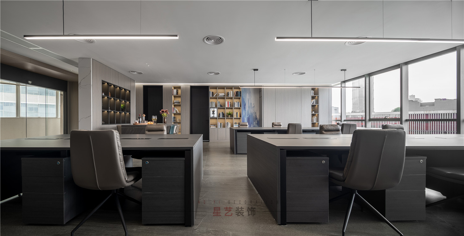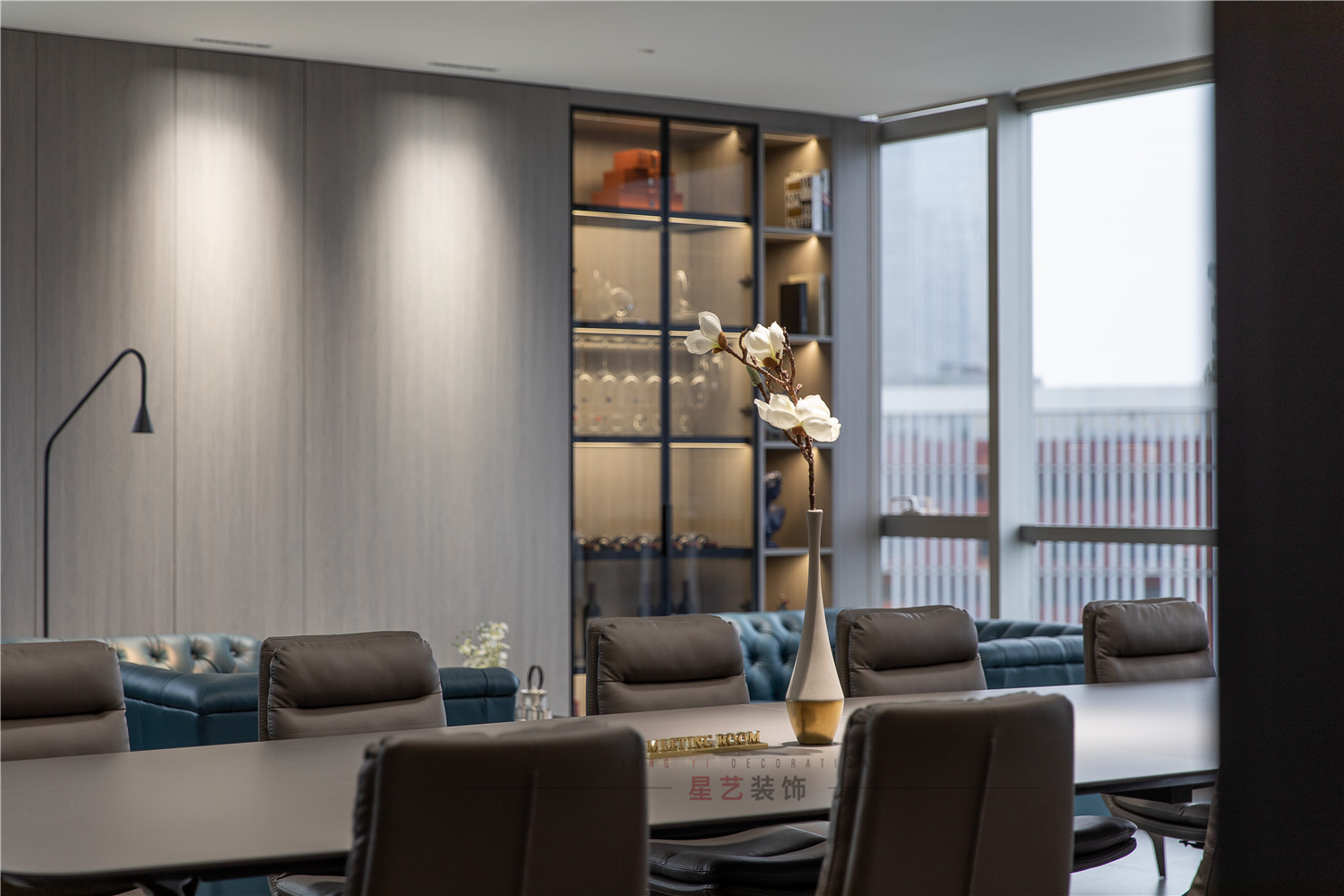 會議區(qū)也可作為接待區(qū),休息區(qū),學(xué)習(xí)區(qū),隱形儲物柜實(shí)用又美觀,整面的落地窗讓整個空間干凈明亮,既能享受家的愜意,也能減少工作帶來的的浮躁與不安。