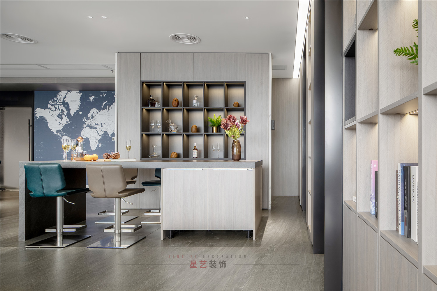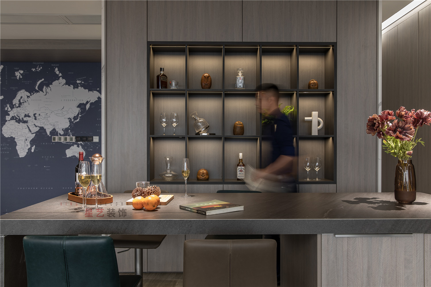 水吧部分直接設(shè)計了酒水柜,并且暖色的燈光直接把氛圍感拉滿,在休息時間也能感受溫馨浪漫的環(huán)境。