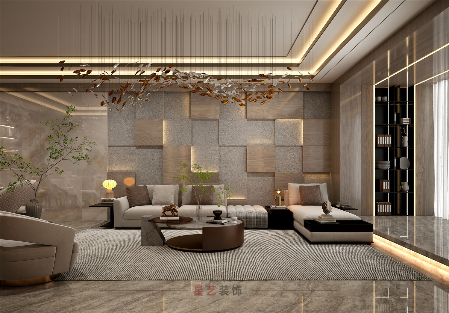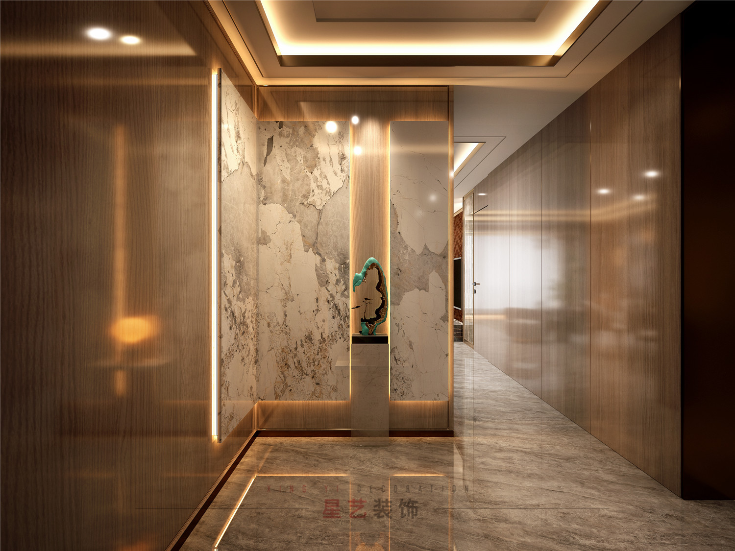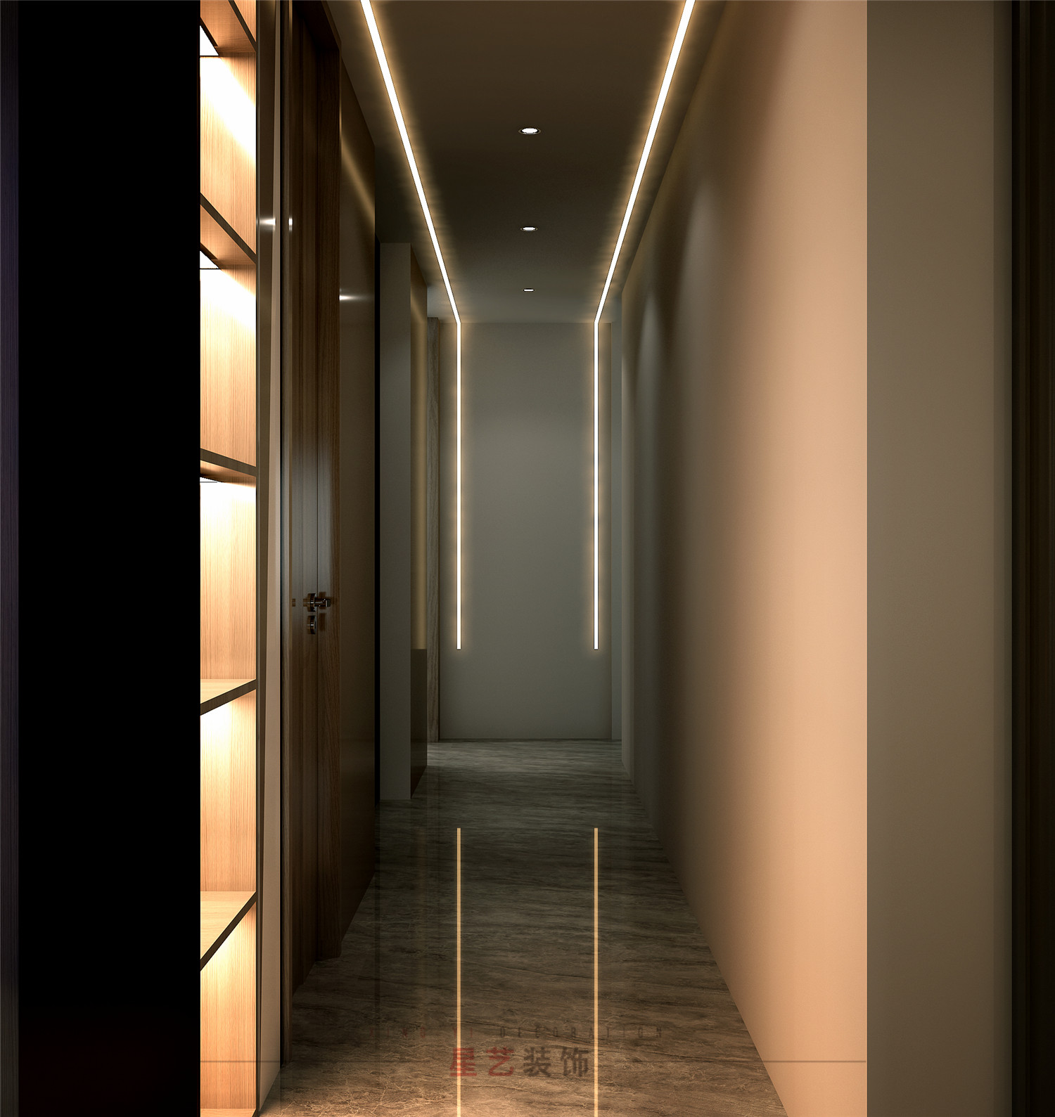 進(jìn)來玄關(guān),滿眼都是余暉落日中的浩瀚星空。輕奢細(xì)致的軟裝布置與現(xiàn)代材質(zhì)組合,尤其是靈活的線燈布置,上一秒沉溺于晚霞的浪漫,下一秒便回歸科技生活,使“自然”與“奢華”這兩種不同的氣質(zhì)得以共生。