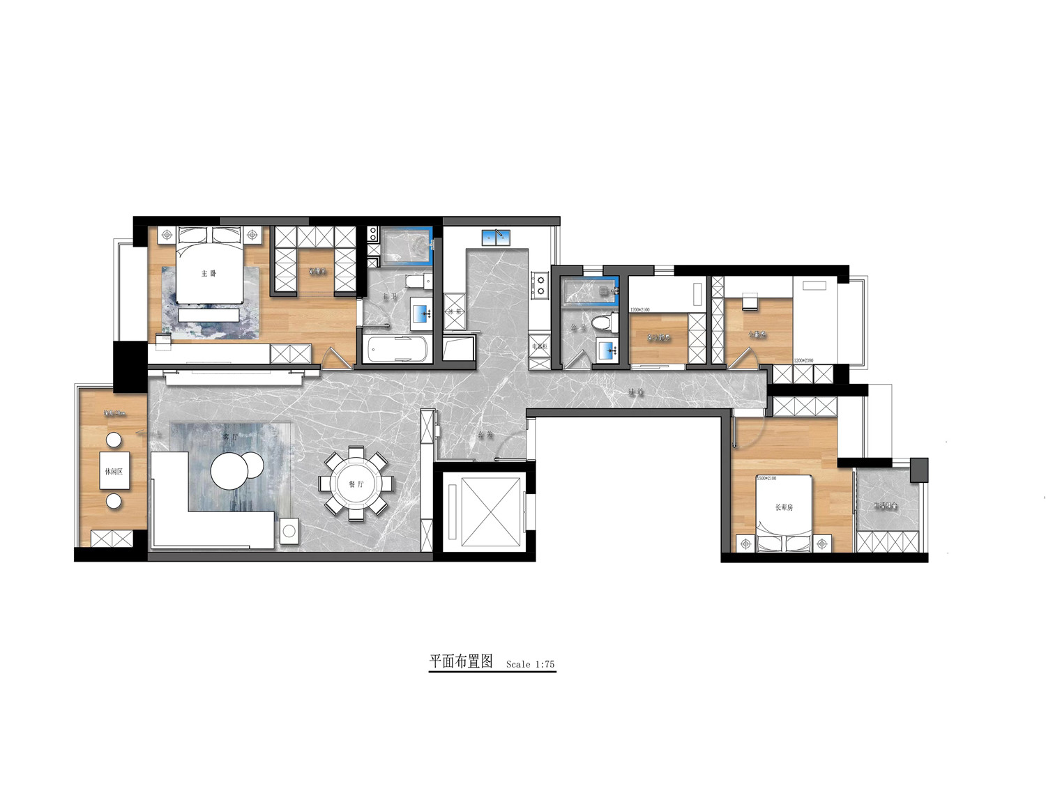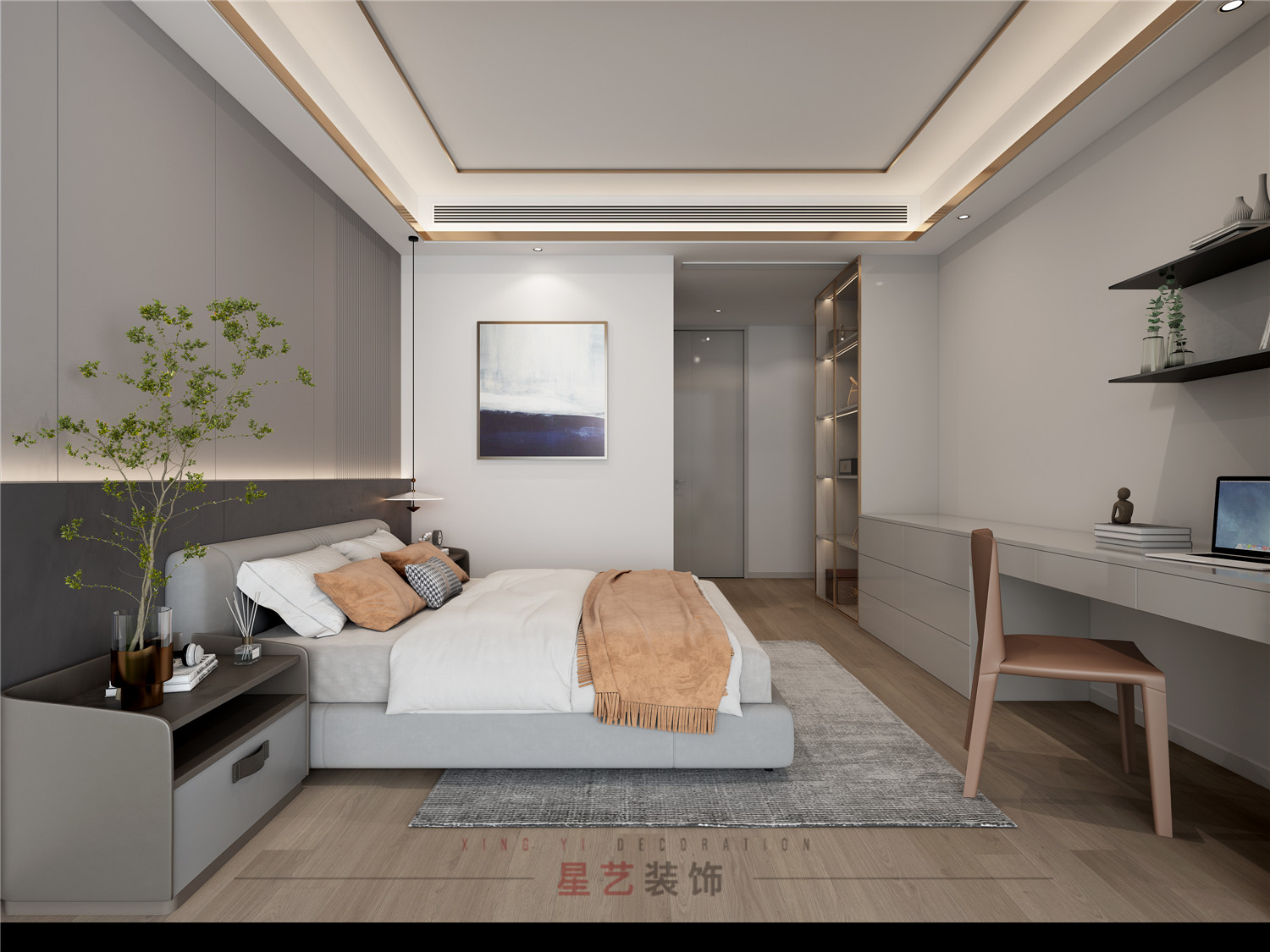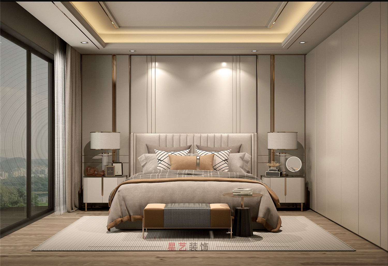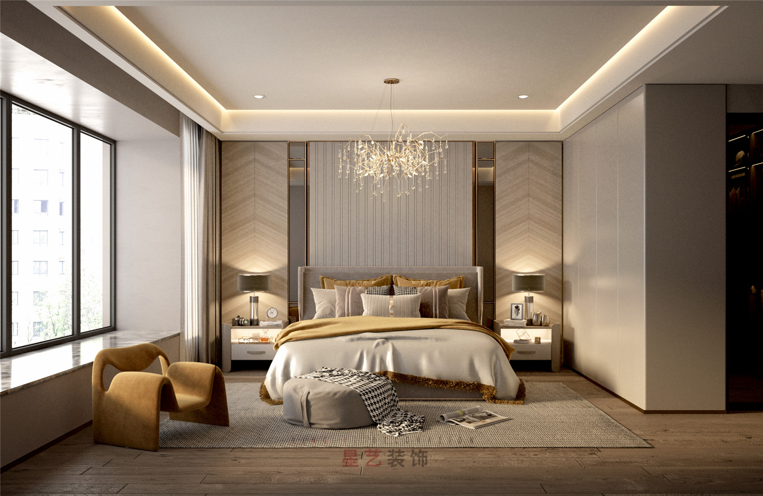 主人房與長輩房風(fēng)格比較相似,對稱式的空間分割方式表現(xiàn)出細(xì)膩的質(zhì)感層次,布局上疏密有度,簡繁相適。