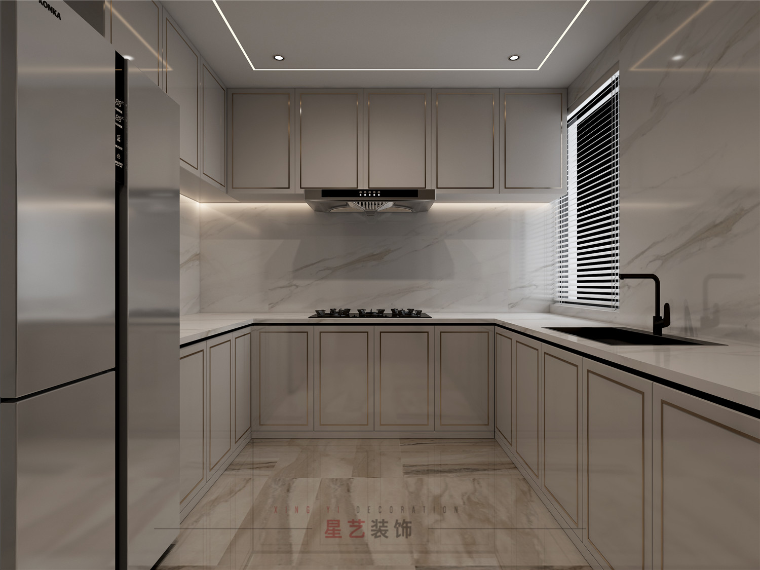 廚房以經(jīng)典的黑白組合搭配金屬邊框點綴,大理石墻面與地面相呼應(yīng),設(shè)計感、線條感、質(zhì)感,都到達(dá)一個適度的狀態(tài)。