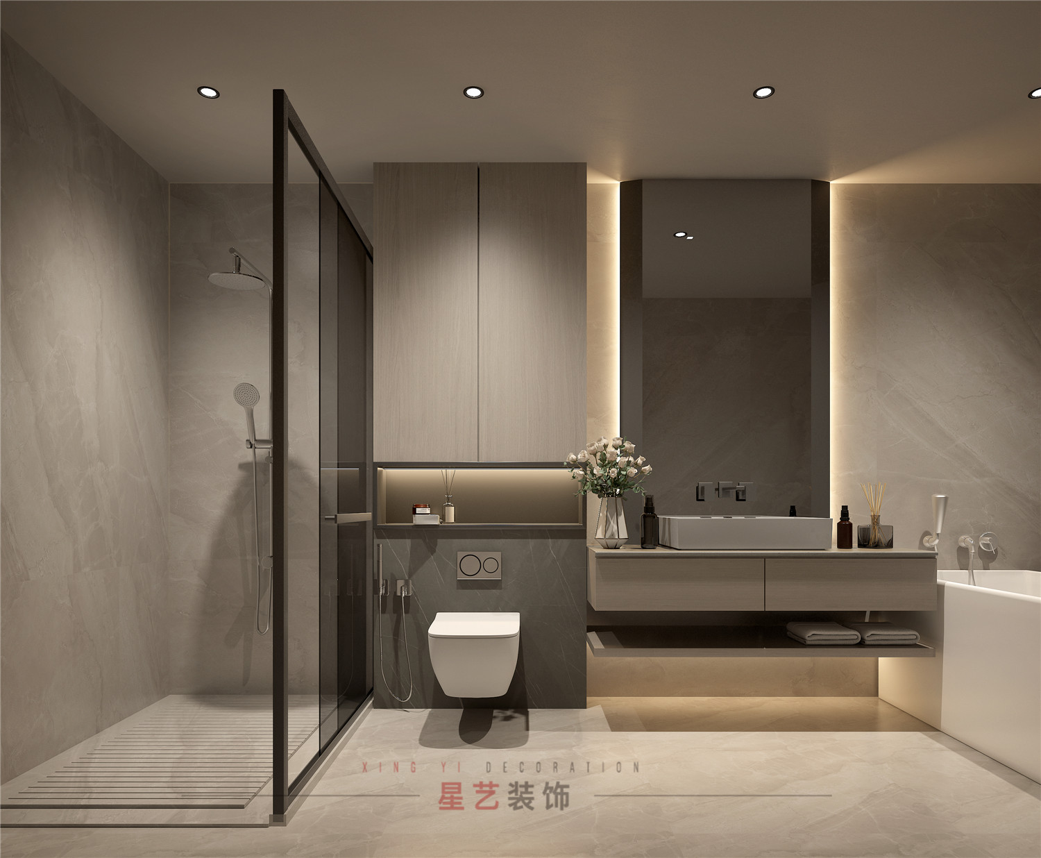 極簡線條的浴室柜更加流暢自然,筒燈與燈帶設(shè)計相結(jié)合,燈光效果別具一格。壁掛馬桶,顏值在線而且無衛(wèi)生死角,磨砂感瓷磚,壁掛浴室柜,每一件物品都是精挑細(xì)選,搭配起來氣質(zhì)和諧。