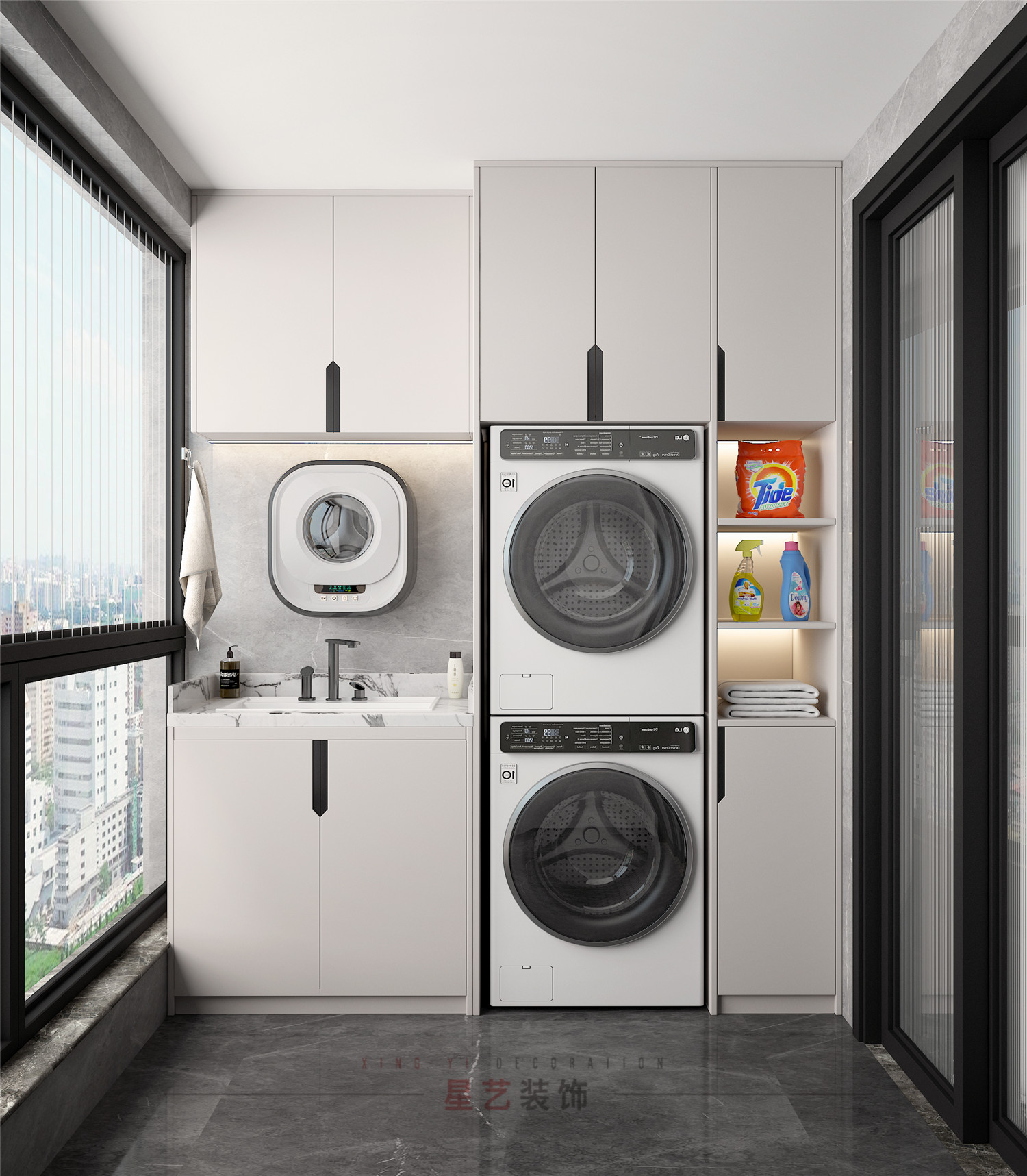 陽臺上布置洗衣機(jī),洗手池與置物柜,將空間的時尚奢華提升到一個新的水平。