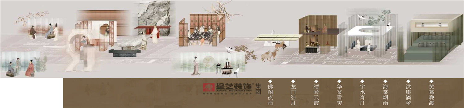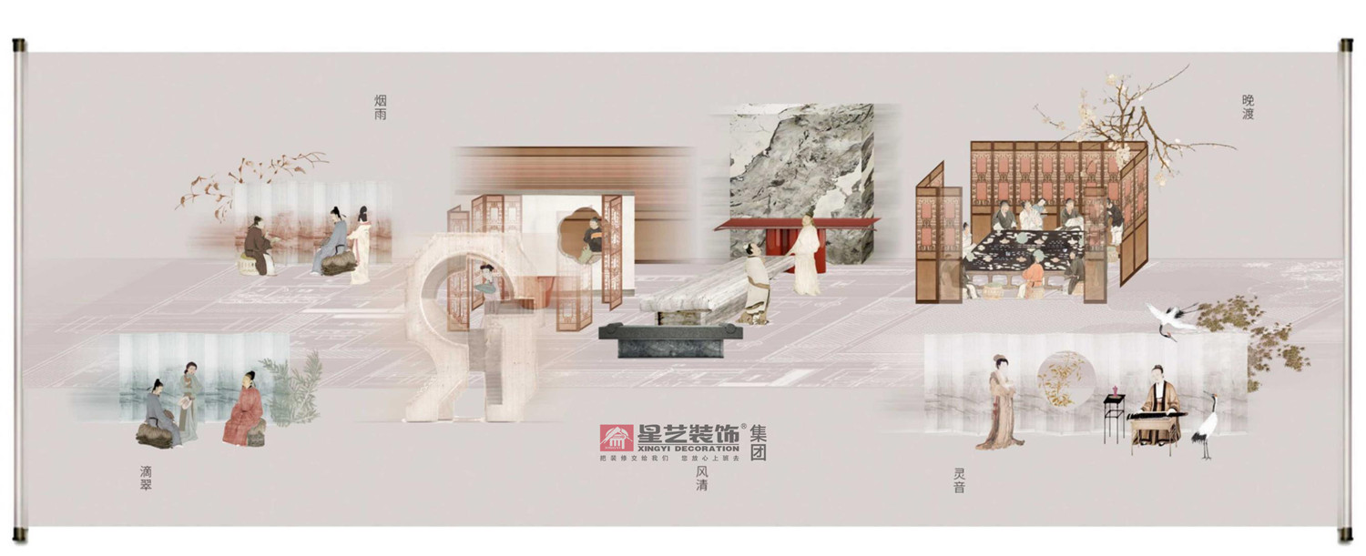 本案以巴蜀十二景為主題思想移步一景,空靈之美耐人尋味,在有象于無(wú)象之間,最稱奇妙。設(shè)計(jì)上講究的是氣韻,“氣韻,生動(dòng)是也”是以現(xiàn)代的表現(xiàn)手法呈現(xiàn)中式的精神內(nèi)核。