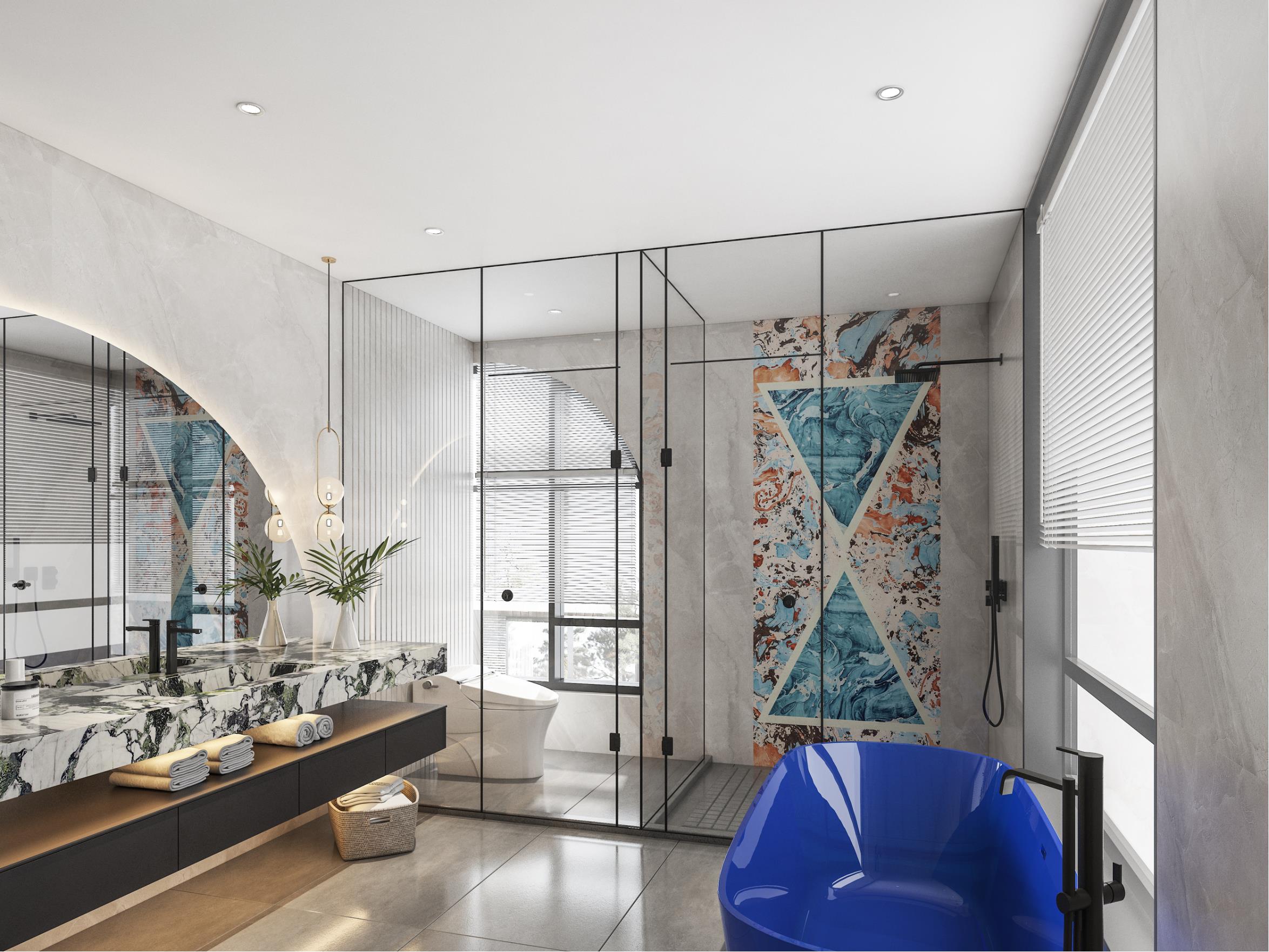 時(shí)尚現(xiàn)代的衛(wèi)生間簡(jiǎn)潔而清爽,愛(ài)馬仕橙與海洋藍(lán)的巖板增加空間藝術(shù)層次感。